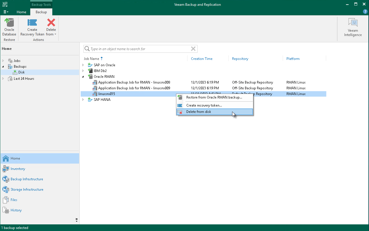 - In the working area, right-click the backup job object name and select Delete from disk.