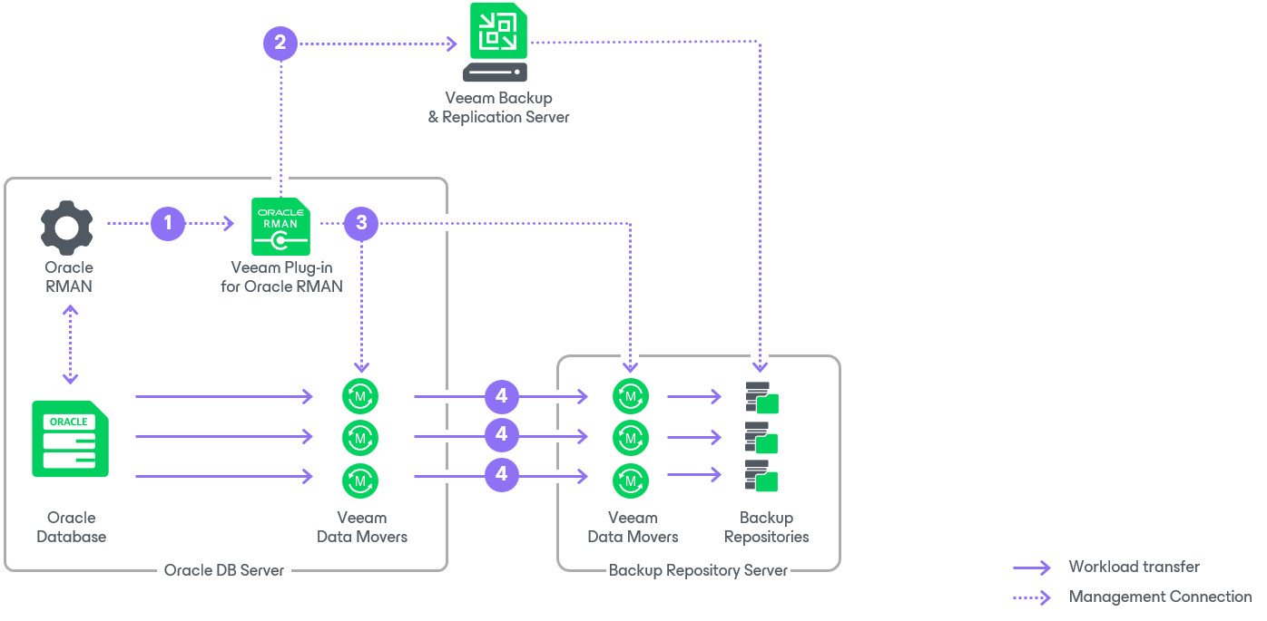 Veeam Plug-in functions as an agent between Oracle RMAN and Veeam backup repository.