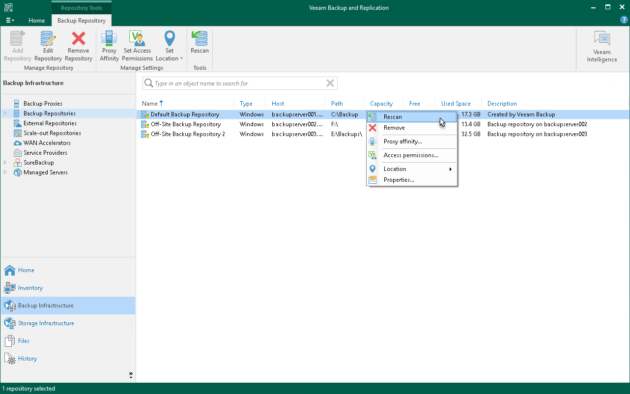 - In the working area, select the required backup repository and click Rescan on the ribbon. Alternatively, you can right-click the backup repository and select Rescan.