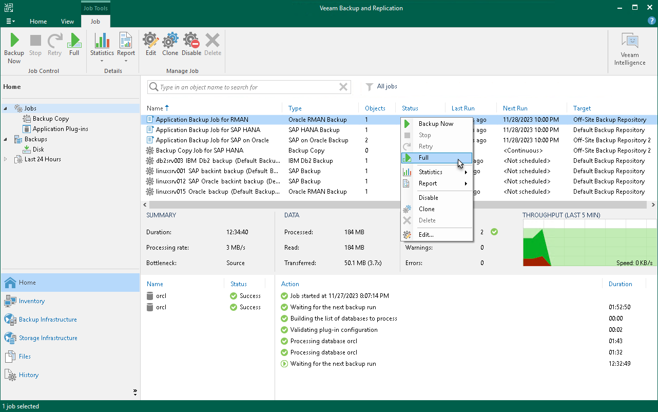 - In the working area, select the backup policy and click Active full on the ribbon or right-click the job and select Full. After that, confirm the backup policy start.