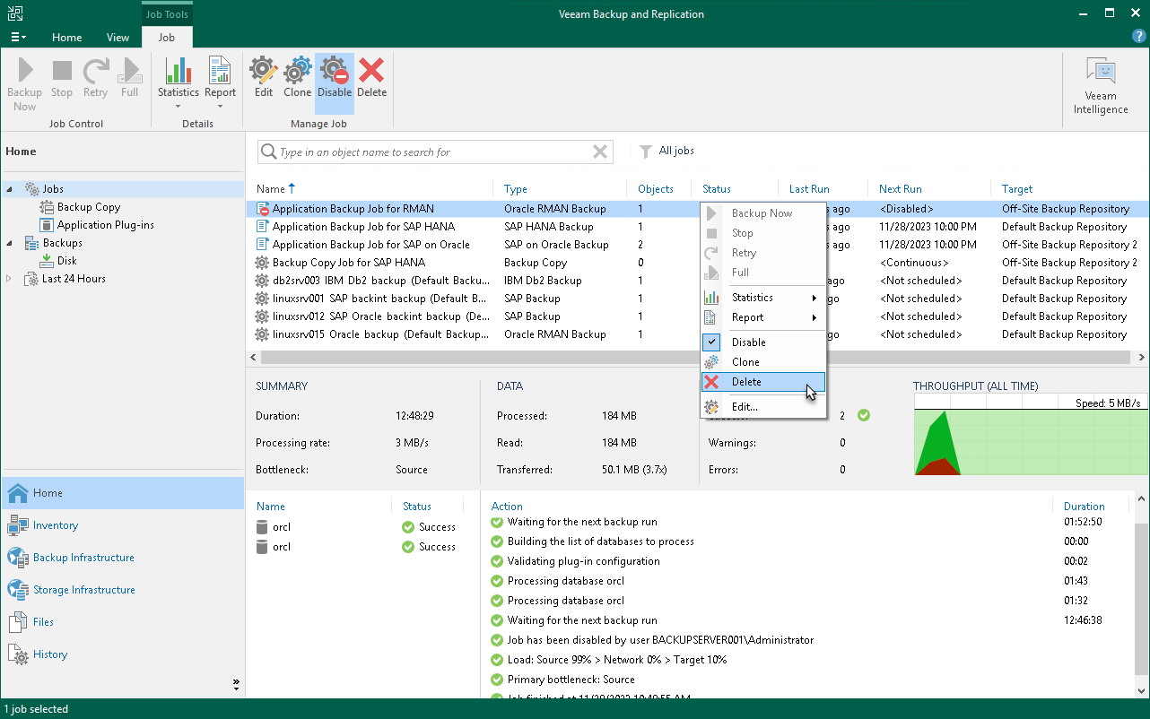 - Wait for Veeam Backup & Replication to disable the application backup policy, then select the backup policy and click Delete on the ribbon or right-click the policy and select Delete.