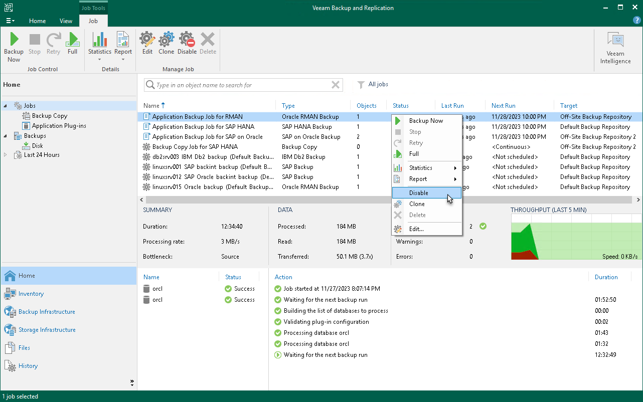 You can temporarily disable scheduled application backup policies configured in Veeam Backup & Replication. When you disable a job, Veeam Backup & Replication does not start the job by the specified schedule. You can start a disabled job manually at any time you need. You can also enable a disabled job at any time.