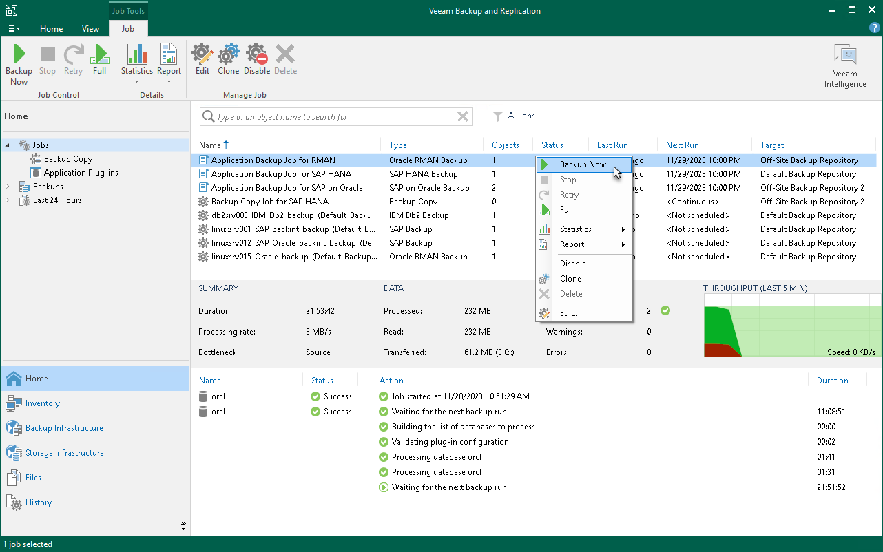 - In the working area, select the backup policy and click Start on the ribbon or right-click the job and select Start.