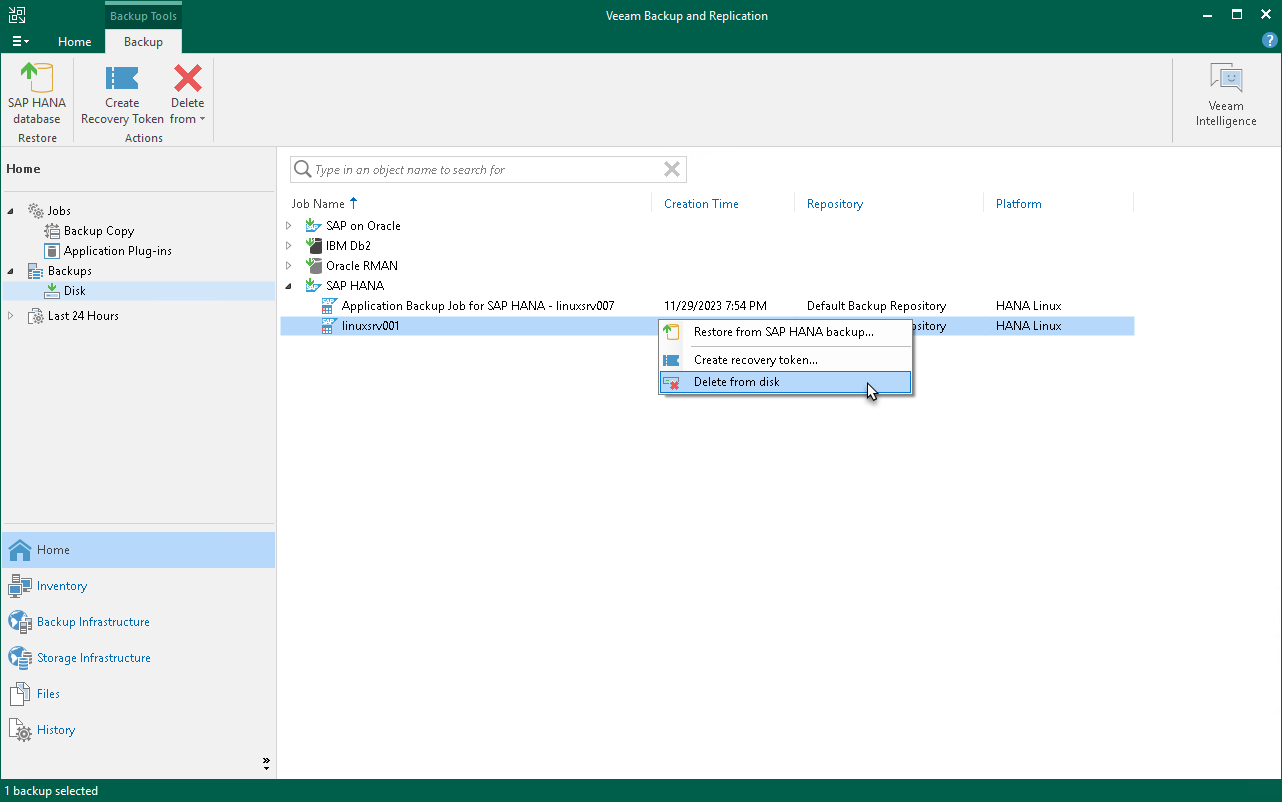 - In the working area, right-click the backup job object name and select Delete from disk.
