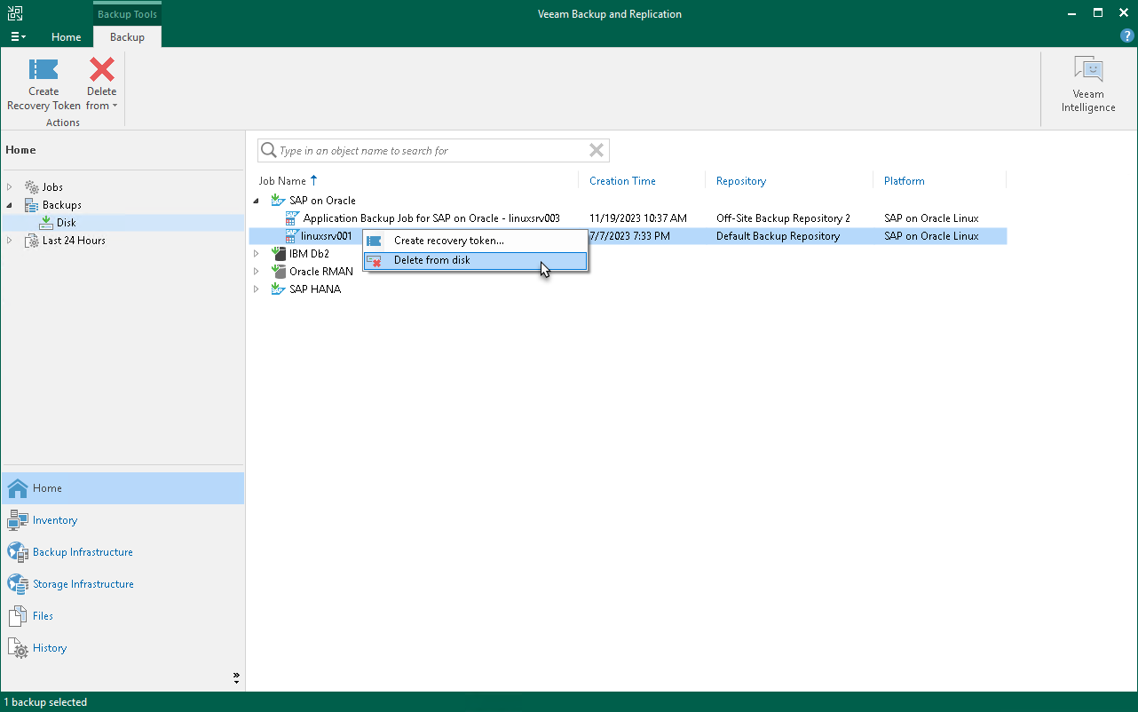 - In the working area, right-click the backup job object name and select Delete from disk.