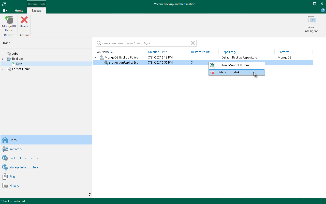 3. In the working area, select the backup and click Delete from > Disk on the ribbon or right-click the backup and select Delete from disk.
