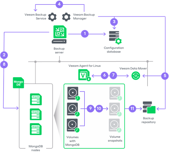 - Veeam Agent for Linux creates a snapshot of all volumes with MongoDB data, reads the backed-up data from the snapshots and transfers data to the backup repository.