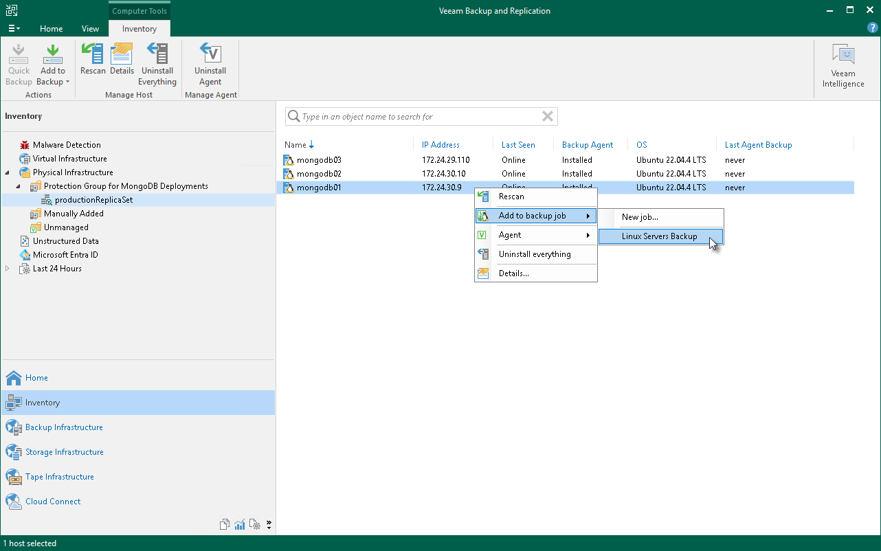 You can add a specific protected computer to a Veeam Agent backup job that you have configured in Veeam Backup & Replication. This may be useful if you want to create an image-level backup of the protected computer with Veeam Agent for Linux in addition to the application-level backup of MongoDB data. To learn more about Veeam Agent backup jobs, see the Adding Computer to Backup Job section in the Veeam Agent Management Guide.