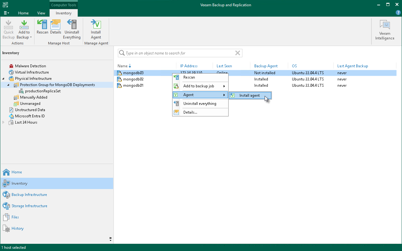 You can install Veeam Agent on a specific protected computer in the inventory. This operation may be required, for example, if you want to test the installation process before allowing Veeam Backup & Replication to deploy Veeam Agent to all computers included in the protection group.