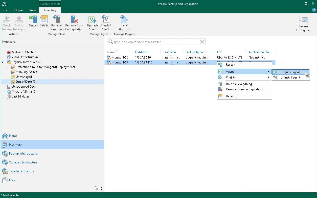 - In the inventory pane, in the Physical Infrastructure node, select the Out of Date protection group and click Upgrade Agents on the ribbon or right-click the Out of Date protection group and select Upgrade.