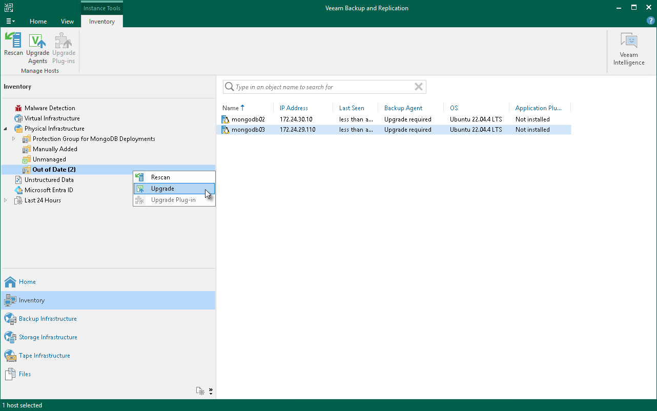 In the Veeam Backup & Replication console, you can upgrade Veeam Agents on the computers that are added to a protection group for MongoDB.
