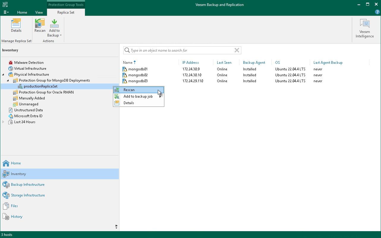 - In the inventory pane, select the replica set and click Rescan on the ribbon or right-click the replica set and select Rescan.