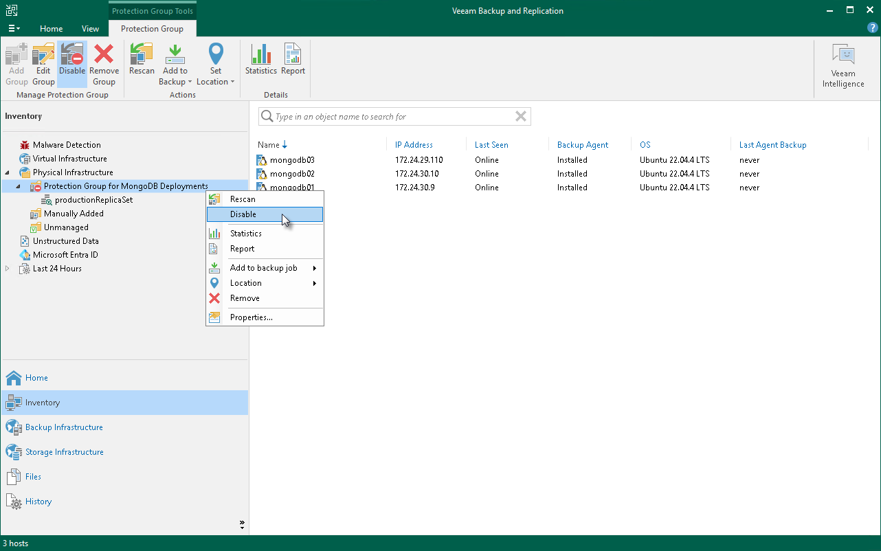 - In the inventory pane, select the necessary protection group and click Disable on the ribbon or right-click the necessary protection group and select Disable.