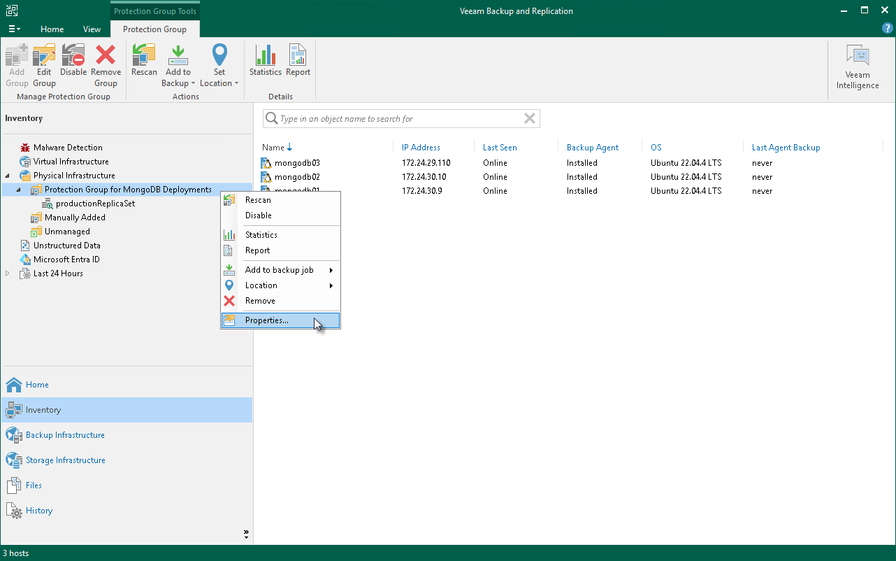 - In the inventory pane, select the protection group that you want to edit and click Edit Group on the ribbon or right-click the protection group that you want to edit and select Properties.