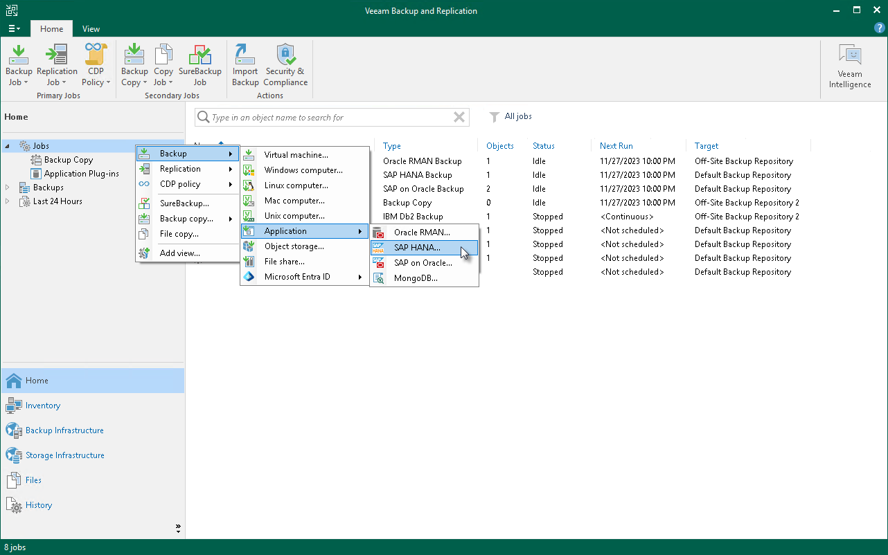 To create an application policy for Veeam Plug-in for SAP HANA, you must launch the New Application Backup Policy wizard. To do this, on the Home tab, click Backup Job > Application > SAP HANA.
