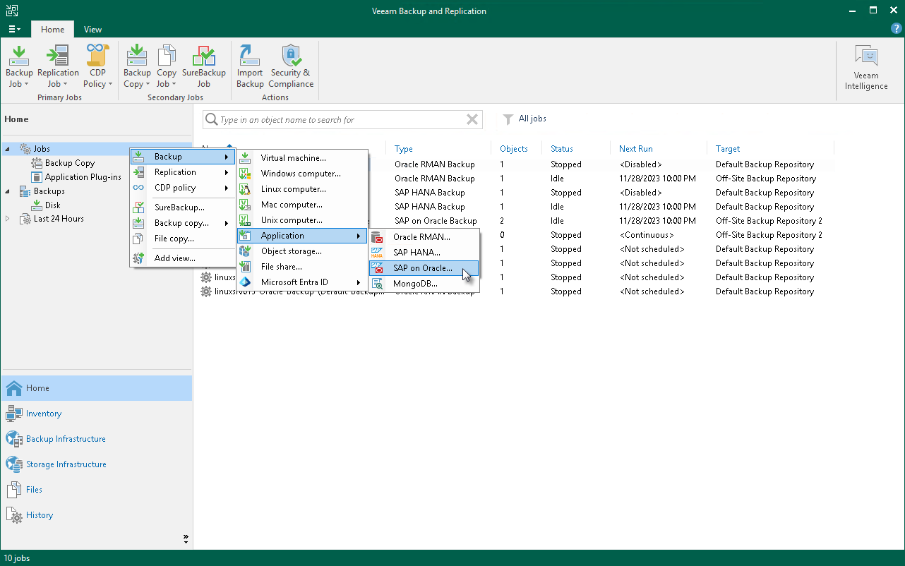 To create an application policy for Veeam Plug-in for SAP on Oracle, you must launch the New Application Backup Policy wizard. To do this, on the Home tab, click Backup Job > Application > SAP on Oracle.