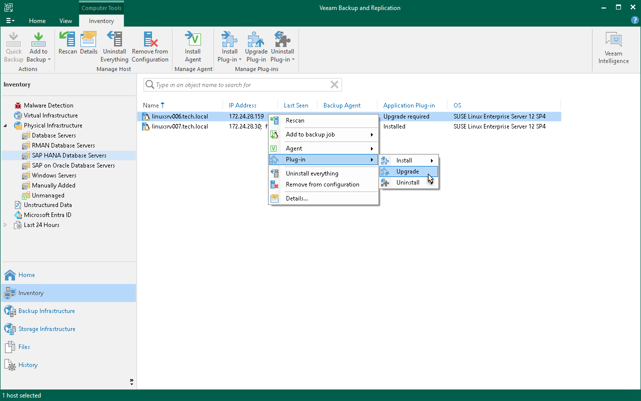 - In the working area, select the necessary computer and click Upgrade Plug-in on the ribbon or right-click the computer and select Plug-in > Upgrade.