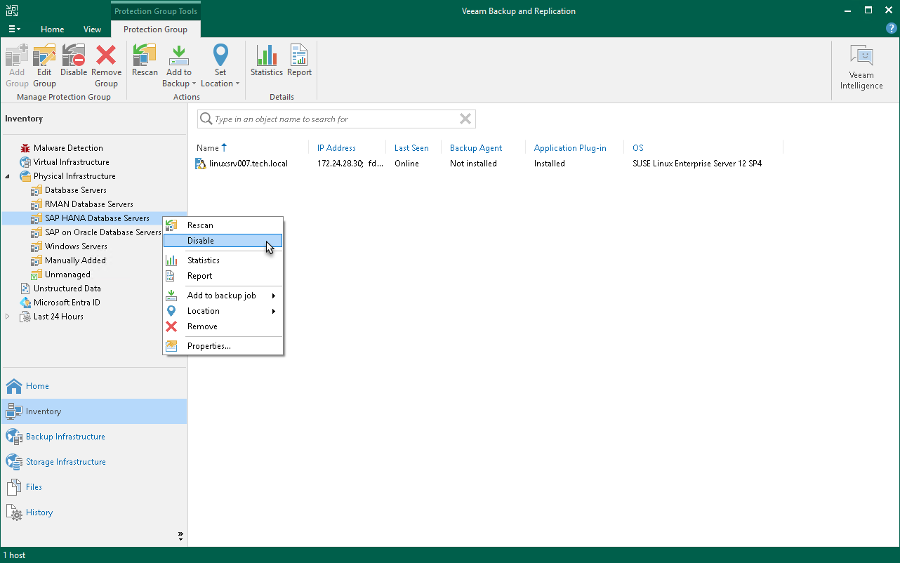 3. In the inventory pane, select the necessary protection group and click Disable on the ribbon or right-click the necessary protection group and select Disable.