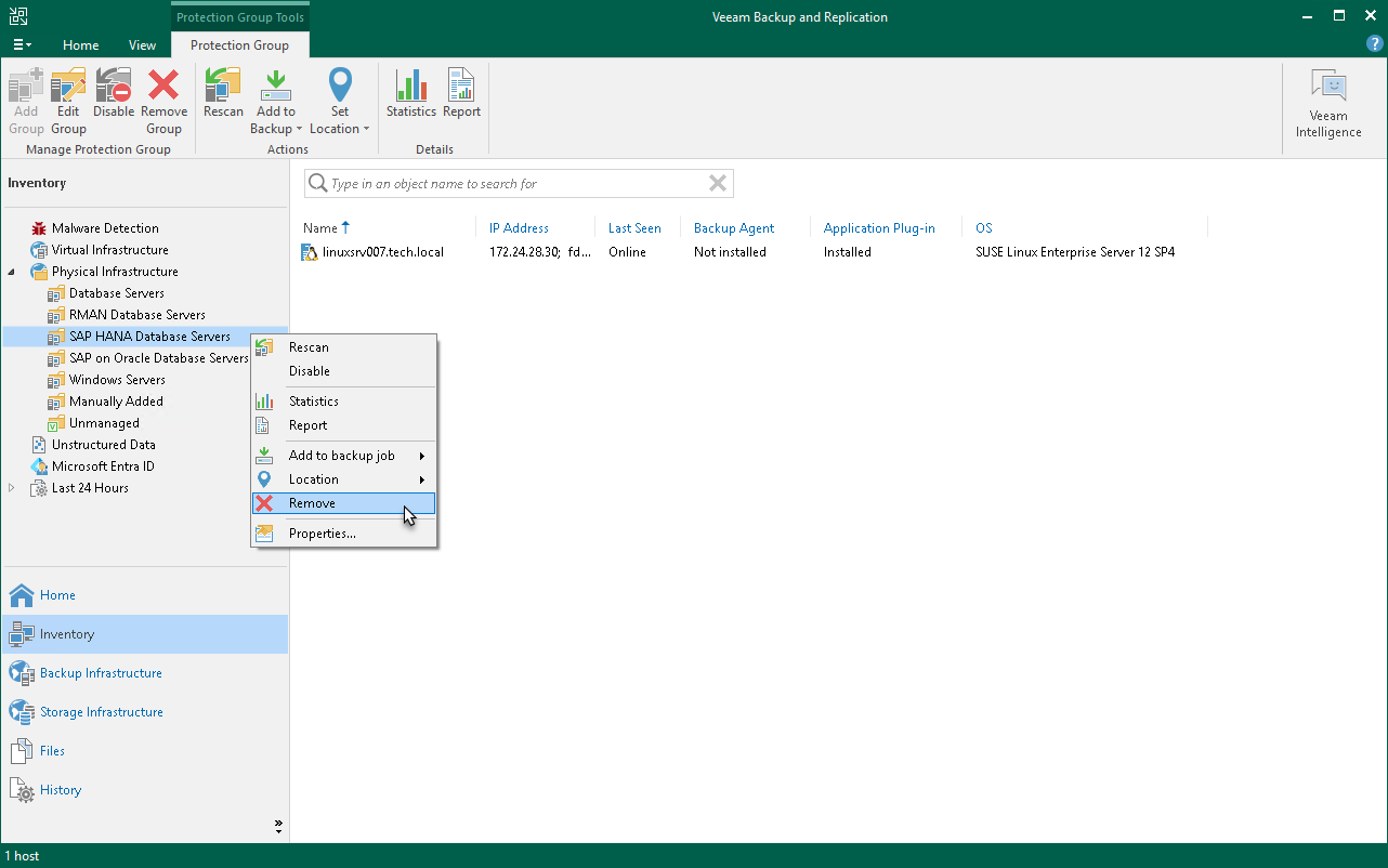 - In the inventory pane, select the protection group that you want to remove and click Remove Group on the ribbon or right-click the protection group and select Remove.