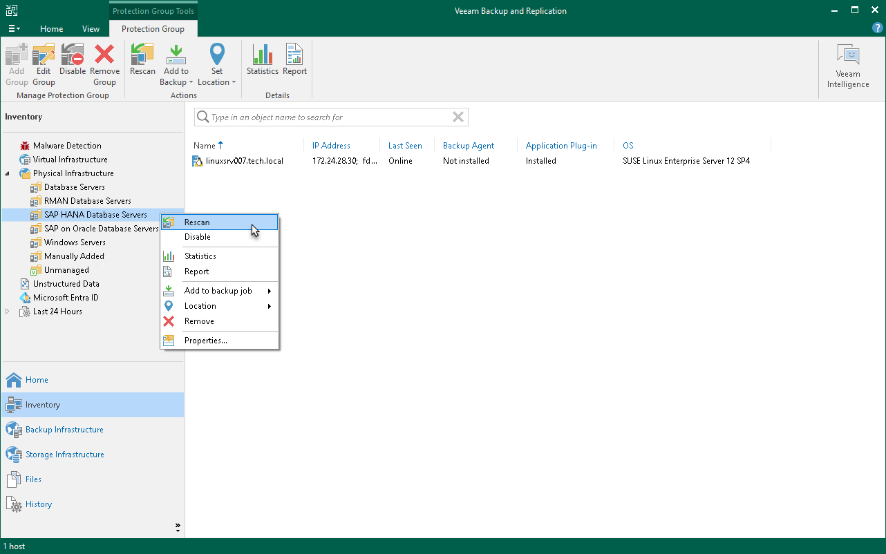 - In the inventory pane, select the necessary protection group and click Rescan on the ribbon or right-click the protection group and select Rescan.
