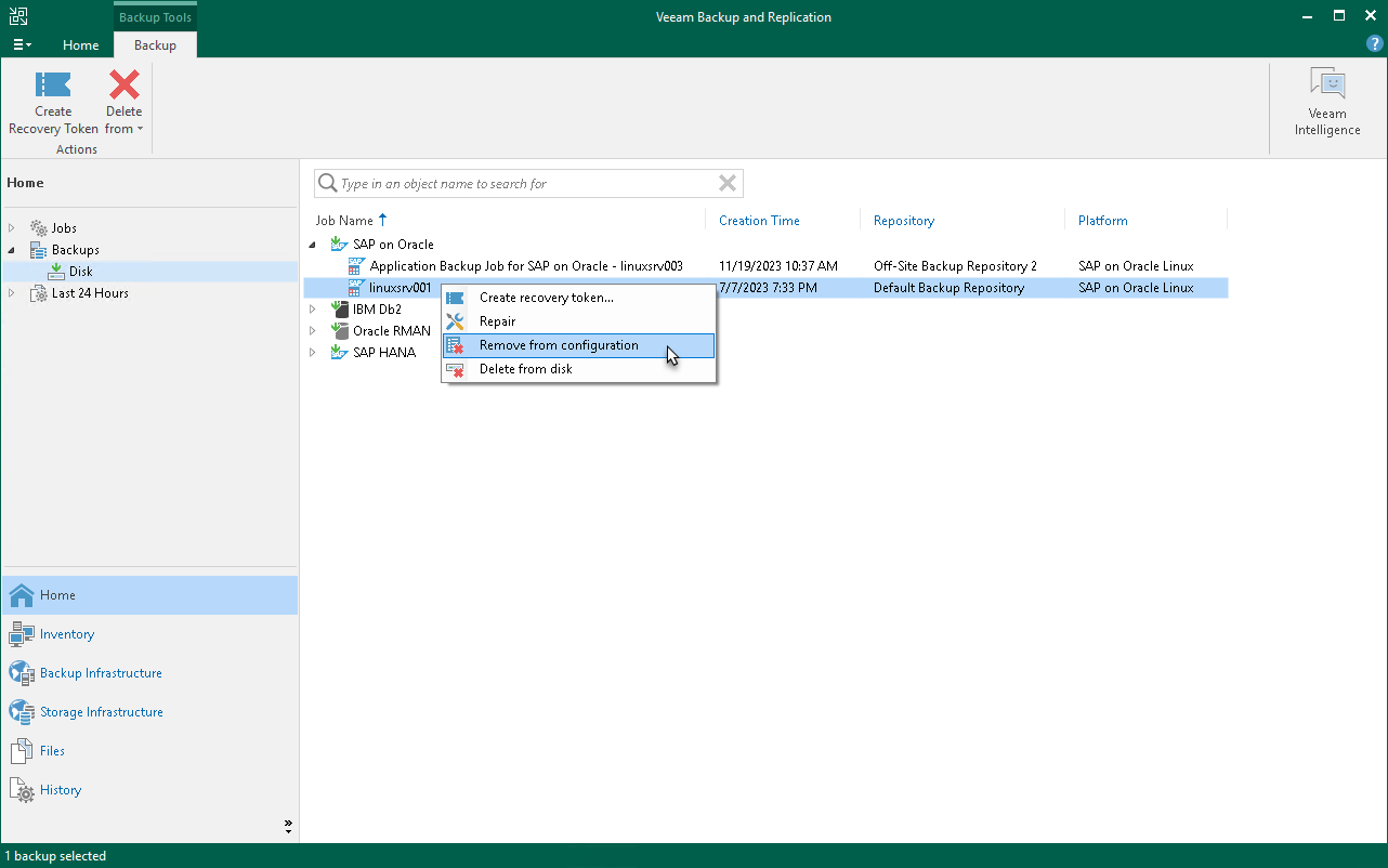 If you want to remove records about backups from the Veeam Backup & Replication console and configuration database, you can use the Remove from configuration operation.