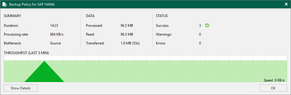 After the application backup policy session statistics becomes available in Veeam Backup & Replication, this statistics appears in the policy statistics window. The job session statistics becomes available in Veeam Backup & Replication on real-time basis.
