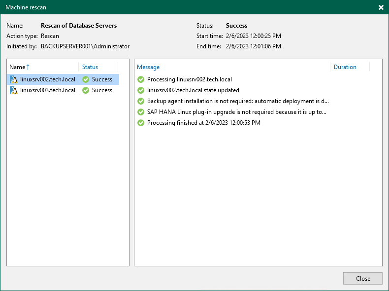 You can view statistics about performed rescan job sessions. When you create a protection group or manually start the discovery process for a protection group or individual protected computer, Veeam Backup & Replication displays statistics for the currently running rescan job session. In the statistics window, Veeam Backup & Replication displays session duration details and a list of operations performed during the job.
