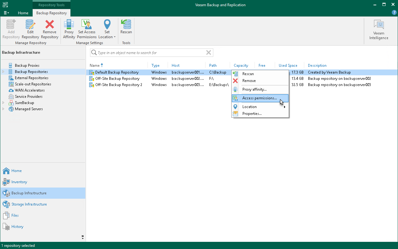 1. In the working area, select the necessary backup repository and click Set Access Permissions on the ribbon or right-click the backup repository and select Access permissions.