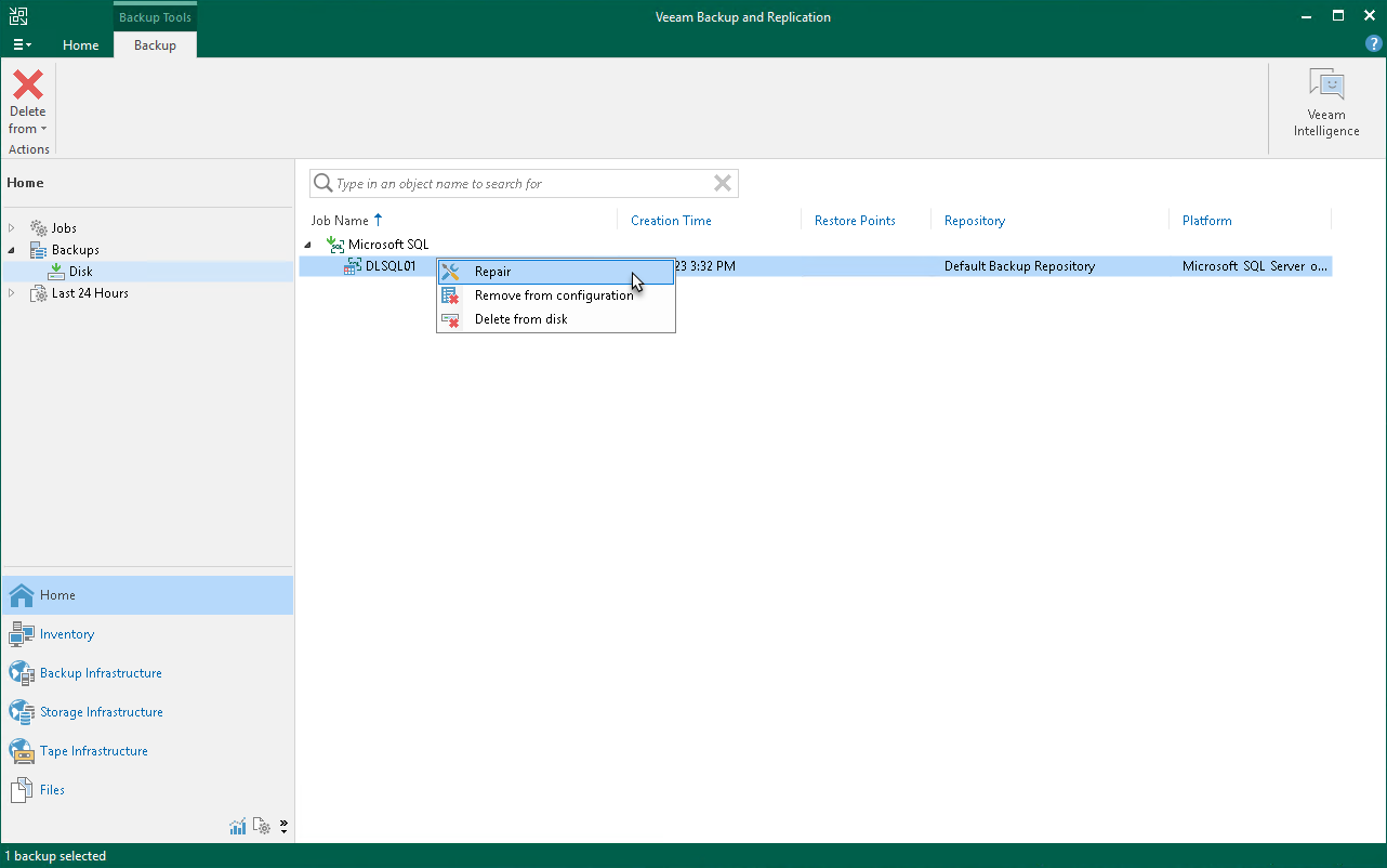 - Press and hold the [Ctrl] key, right-click the backup and select Repair.