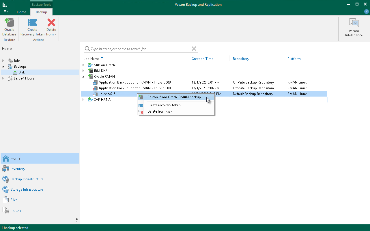 You can restore Oracle databases from Veeam Plug-in backups in the Veeam Backup & Replication console. To restore Oracle databases Veeam Backup & Replication uses Veeam Explorer for Oracle. For details, see the Restoring Oracle RMAN Backups section in the Veeam Explorers User Guide.