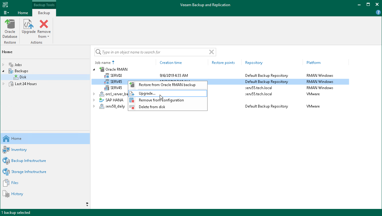 Alternatively, you can select the job or the restore point and click Upgrade on the ribbon.