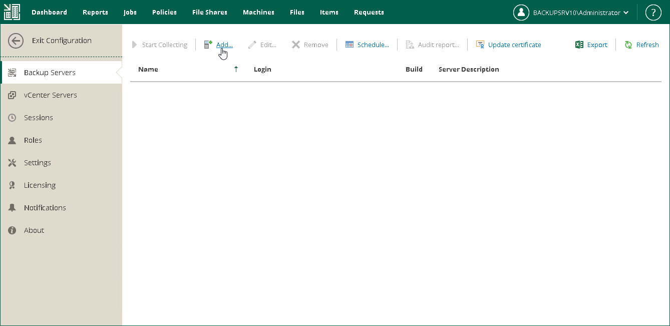 For more information on adding backup servers, see Managing Veeam Backup Servers in the Enterprise Manager User Guide.