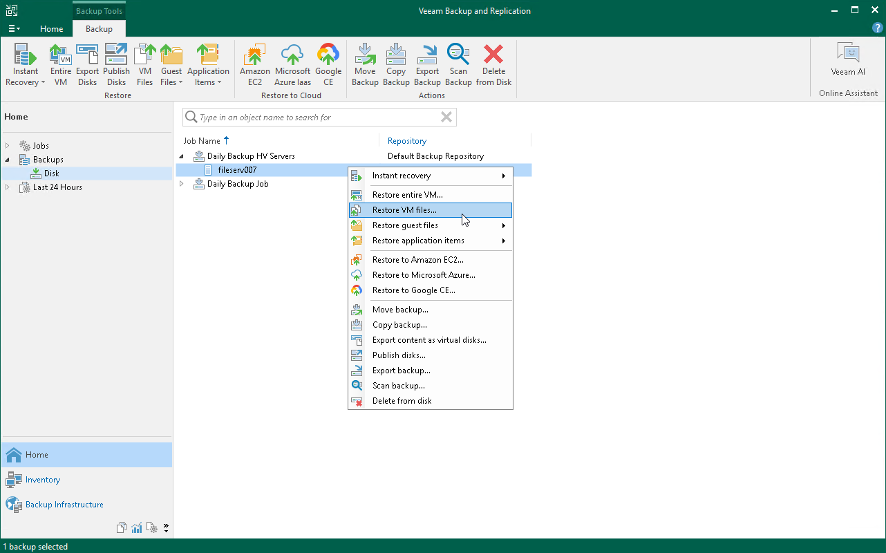 - In the inventory pane, select the Backups > Disk node. Expand a backup job in the working area, right-click a VM and choose Restore VM files to launch the Hyper-V Restore wizard.