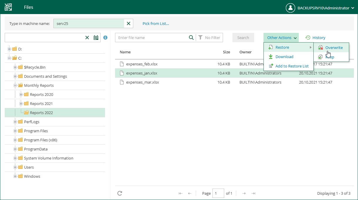 Self-restore allows you to delegate guest OS file restore from backup administrators to users with local Administrator privileges on VMs. Users do not have to wait for backup administrators to recover deleted or modified files and folders.