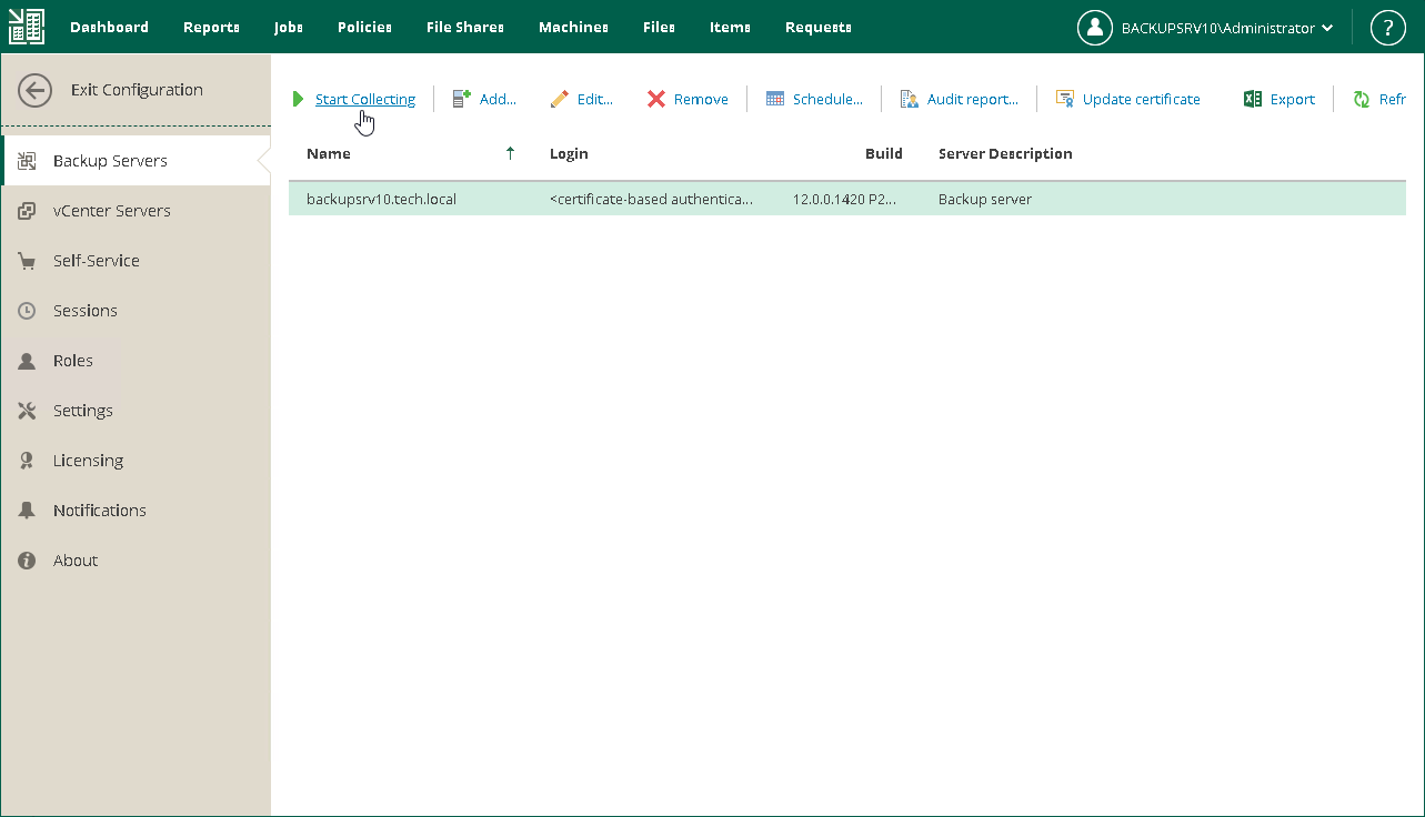 - Select the Backup Servers tab. In the working area, click Start Collecting.