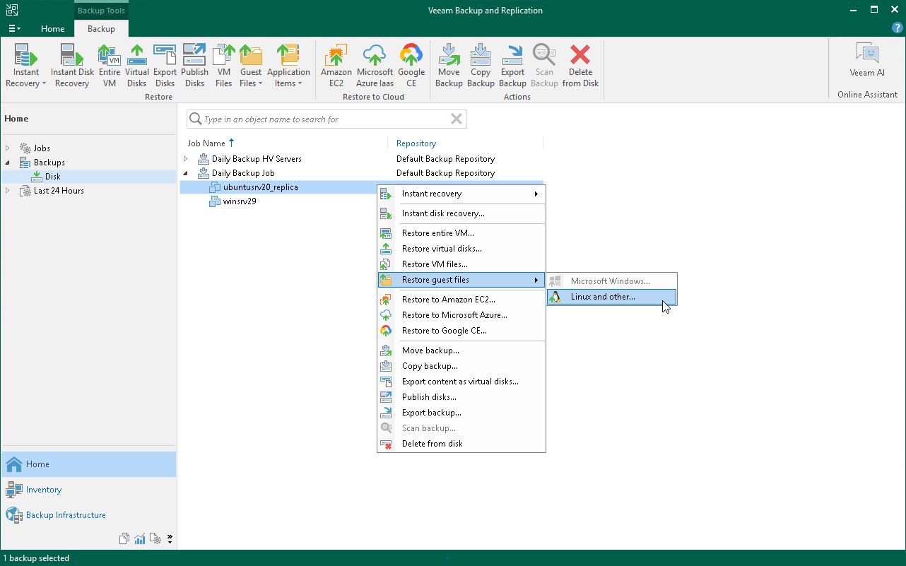 - In the inventory pane, select the Backups > Disk node. Expand a backup job in the working area, right-click a VM and select Restore guest files > Linux and other to launch the Guest File Restore wizard.