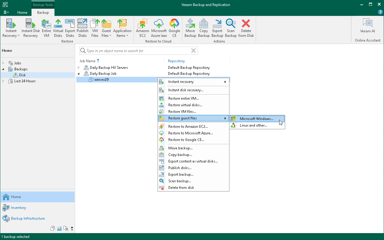 - In the inventory pane, select the Backups > Disk node. Expand a backup job in the working area, right-click a VM and choose Restore guest files > Microsoft Windows to launch the File Level Restore wizard.