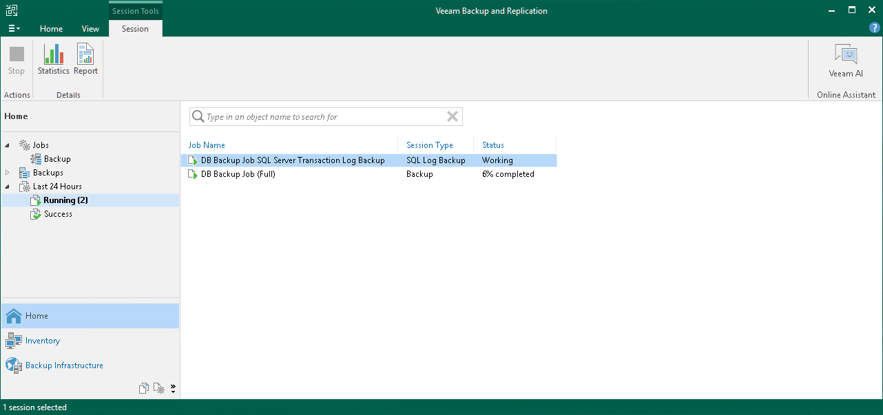 - In the inventory pane of the Home view, expand the Last 24 Hours node to see the created jobs. You must see two jobs: one that processes the Microsoft SQL Server and the other one that ships transaction logs.