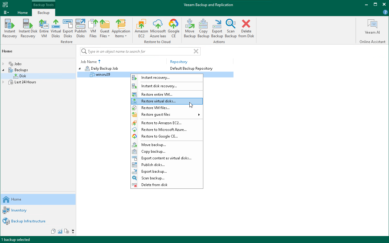 - In the inventory pane, select the Backups > Disk node. Expand the backup job in the working area, right-click a VM and select Restore virtual disks to launch the Virtual Disk Restore wizard.