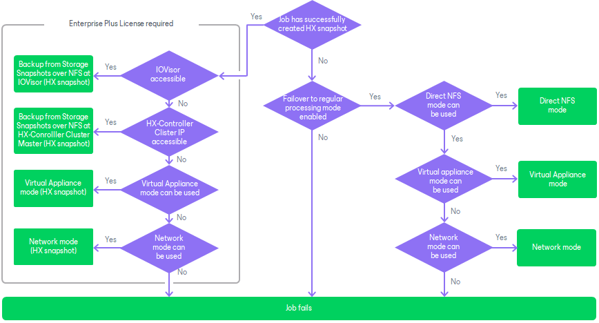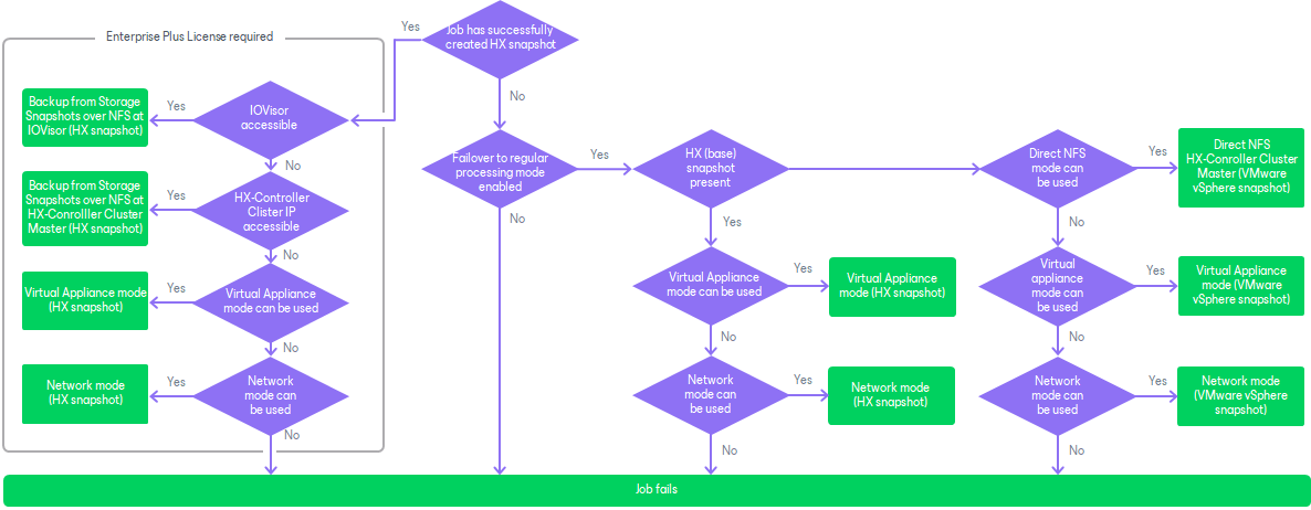 The following diagrams show how Veeam Backup & Replication prioritizes transport modes for each proxy. The diagrams also show how Veeam Backup & Replication chooses proxies when Cisco HyperFlex snapshots cannot be created. In this case, Veeam Backup & Replication performs standard data processing. Note that to use regular data processing, you must enable Failover to standard backup option.