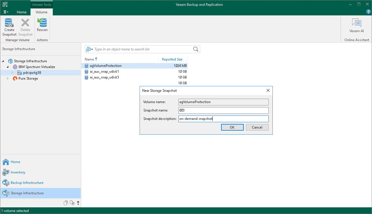 - In the New Storage Snapshot window, specify a name for the created snapshot and provide a description for the snapshot (if the snapshot description field is available).