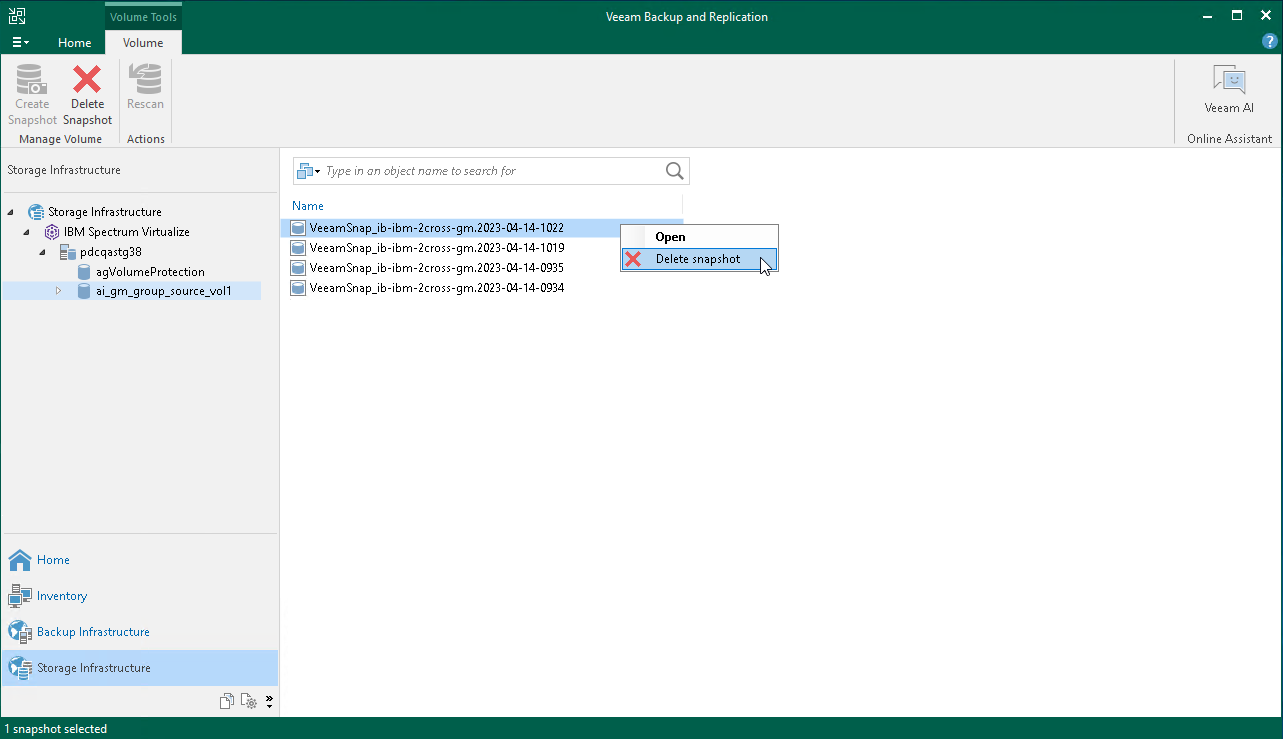You can create and delete storage snapshots in the Veeam Backup & Replication console. The create and delete snapshot operations do not differ from operations that you perform in the management console of the storage system.