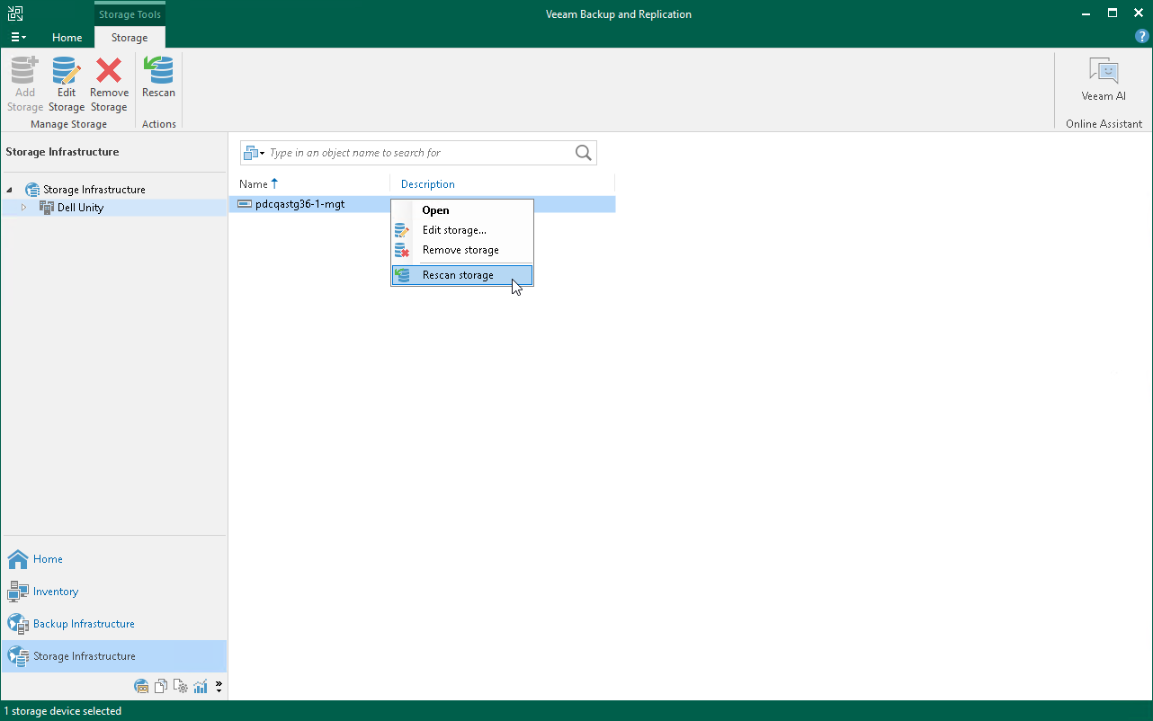 - Click Rescan on the ribbon or right-click the node in the hierarchy and select Rescan storage or Rescan volume.