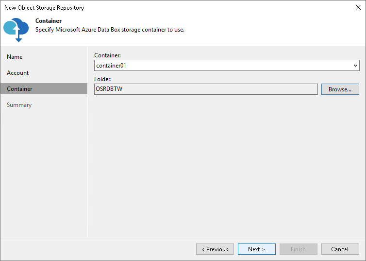 At the Container step of the wizard, specify the container and folder that will be used to store data:
