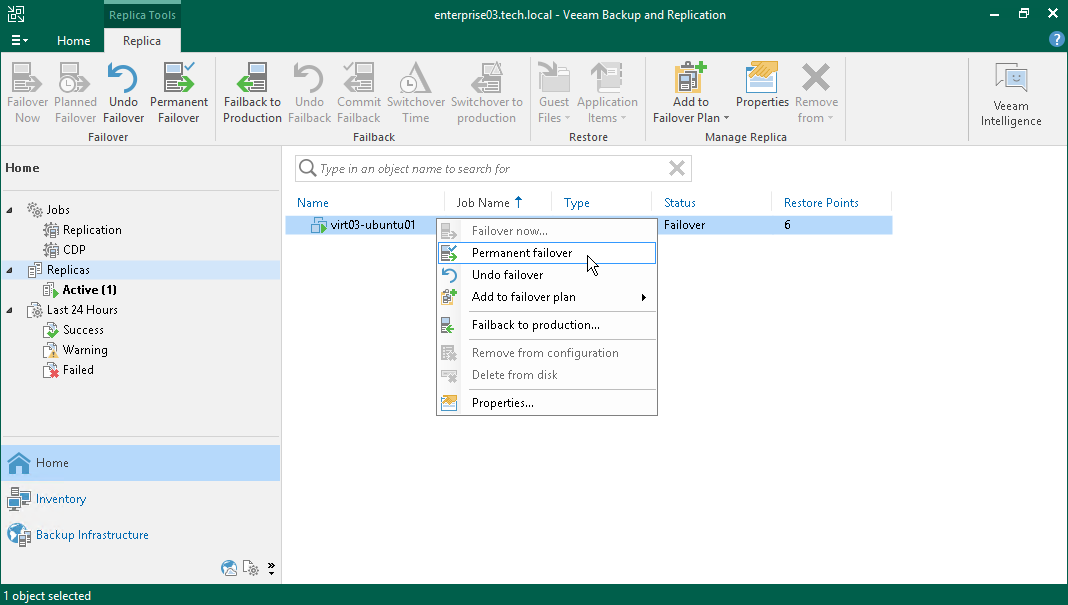 - Open the Home view. In the inventory pane navigate to the Replicas > Active node. In the working area, select the necessary replica and click Permanent Failover on the ribbon.