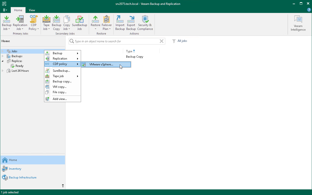 - Open the Home view. In the inventory pane, right-click Jobs and select CDP Policy > VMware vSphere.