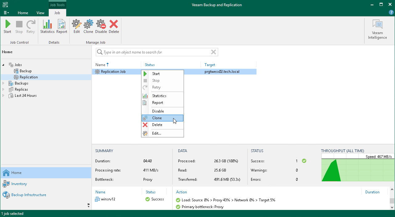 - In the working area, select the job and click Clone on the ribbon or right-click the job and select Clone.