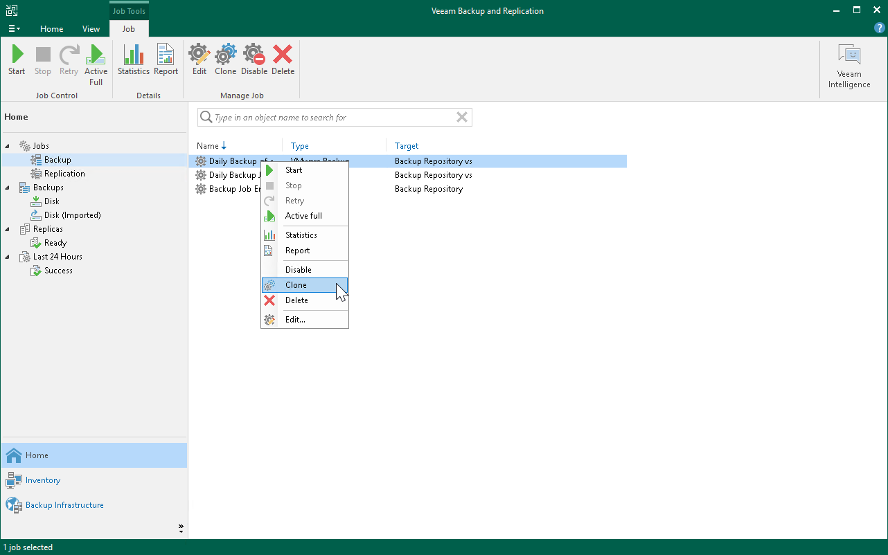 - If the original job is scheduled to run automatically, Veeam Backup & Replication disables the cloned job. To enable the cloned job, select it in the job list and click Disable on the ribbon or right-click the job and select Disable.