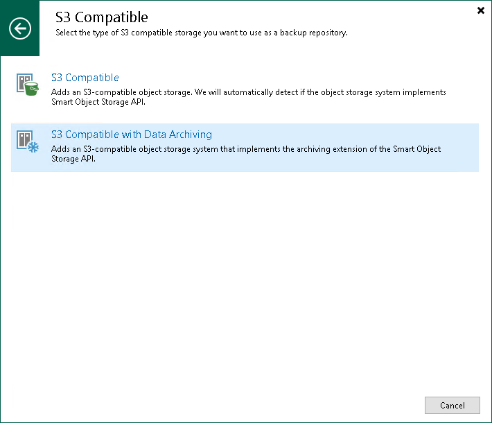 - In the Add Backup Repository window, select Object storage > S3 Compatible > S3 Compatible with Data Archiving.