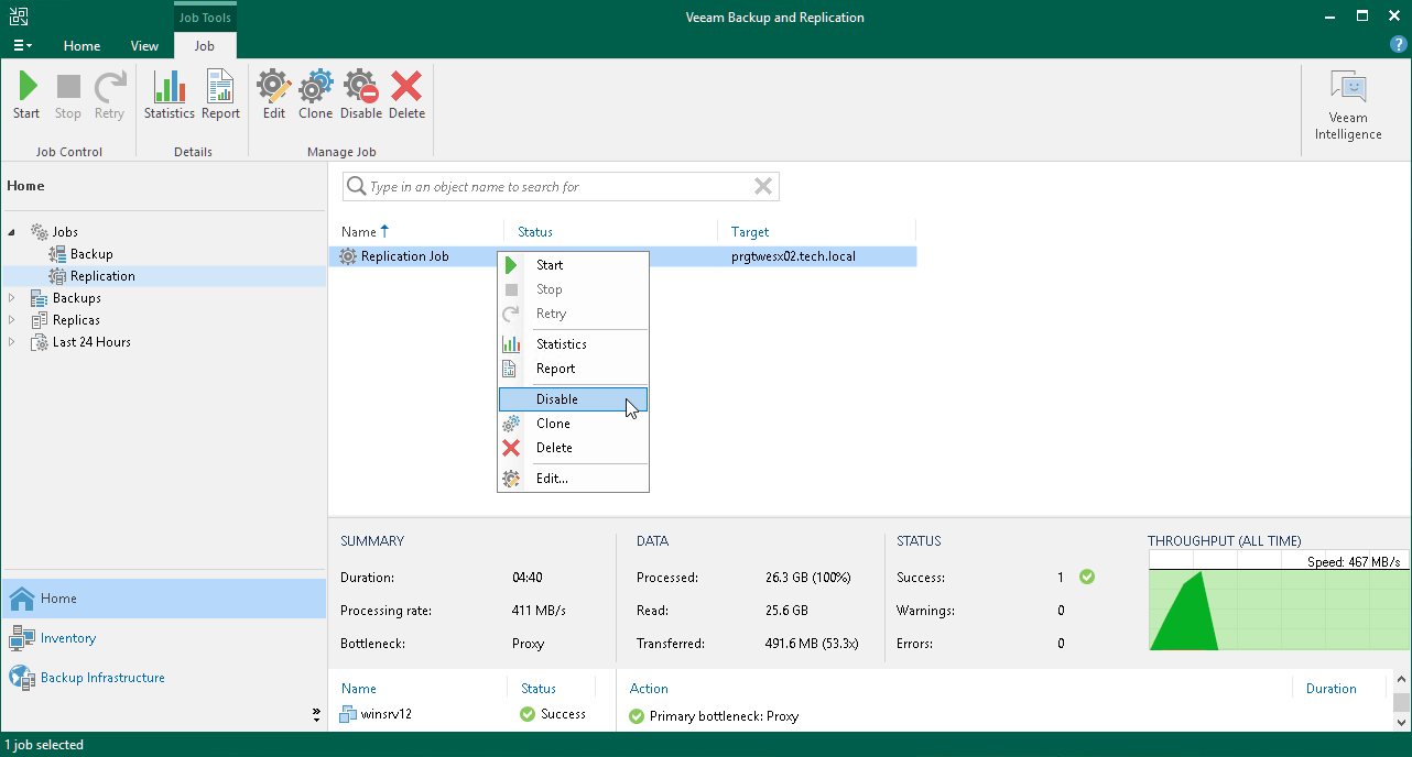 To enable a disabled replication job, select it and click Disable on the ribbon once again.